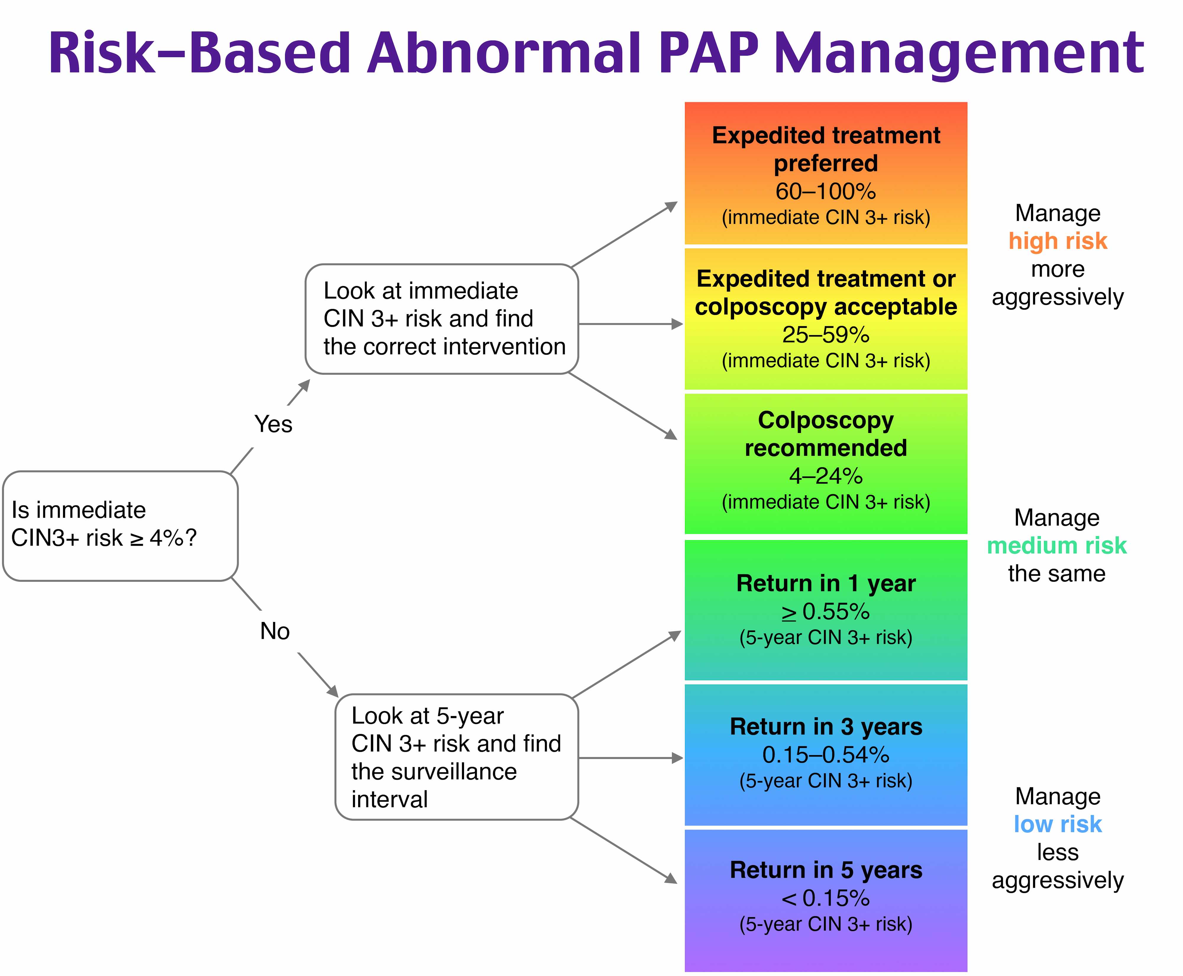 Current guidelines for abnormal cervical cancer screening results recommend equal management for equal risk. Consequently, colposcopy, treatment, or surveillance is based on a patient’s immediate risk of cervical intraepithelial neoplasia grade 3 or worse (CIN 3+), which is determined by a combination of current results and past history. Atypical squamous cells of undetermined significance (ASC-US) are cells with abnormalities that do not show a squamous intraepithelial lesion. Patients with ASC-US who have a positive human papillomavirus (HPV) cotest and unknown previous history of HPV have an immediate risk of CIN 3+ equal to 4.45%. This exceeds the > 4% threshold recommended for management with colposcopy in women who are age ≥ 25.
