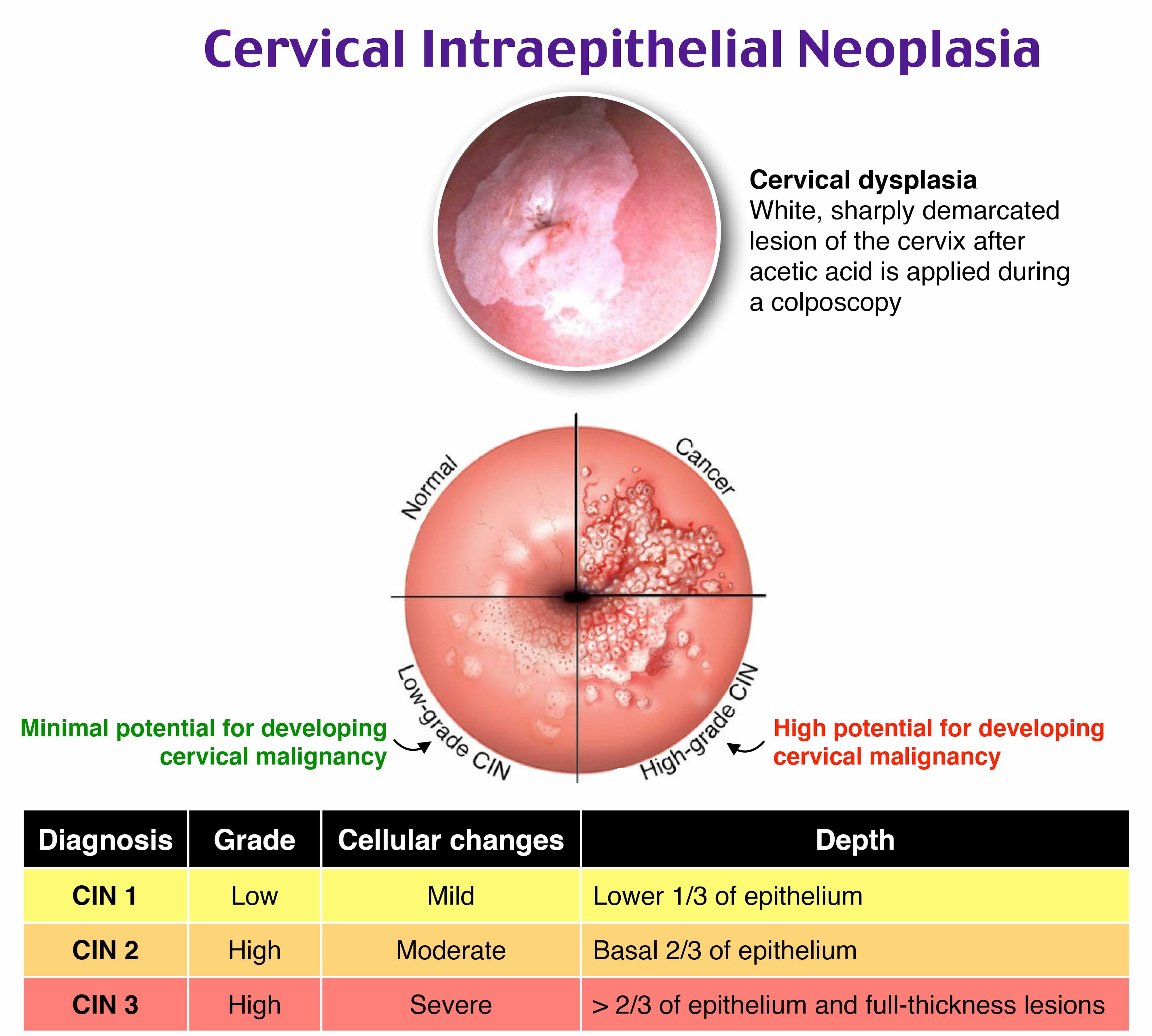 Colposcopy with guided biopsies is the gold standard in identifying premalignant disease. Cervical intraepithelial neoplasias are premalignant conditions of the cervix affecting the ectocervix. Women with low-grade cervical intraepithelial neoplasia have a lower risk of lesion progression to invasive disease, while those with high-grade lesions are at higher risk. Management of high-grade squamous intraepithelial lesion (HSIL) may be either expedited treatment or colposcopy with directed biopsies. Close follow-up may occur when histology confirms low-risk lesions such as CIN 1 only when the squamocolumnar junction and the upper limit of any lesion were fully visualized and endocervical sampling, if collected, was less than CIN 2. If a colposcopy is preceded by HSIL and is inadequate, an excisional procedure is indicated. Loop electrosurgical excision procedure, cold knife conization, and laser conization are examples of excisional procedures.