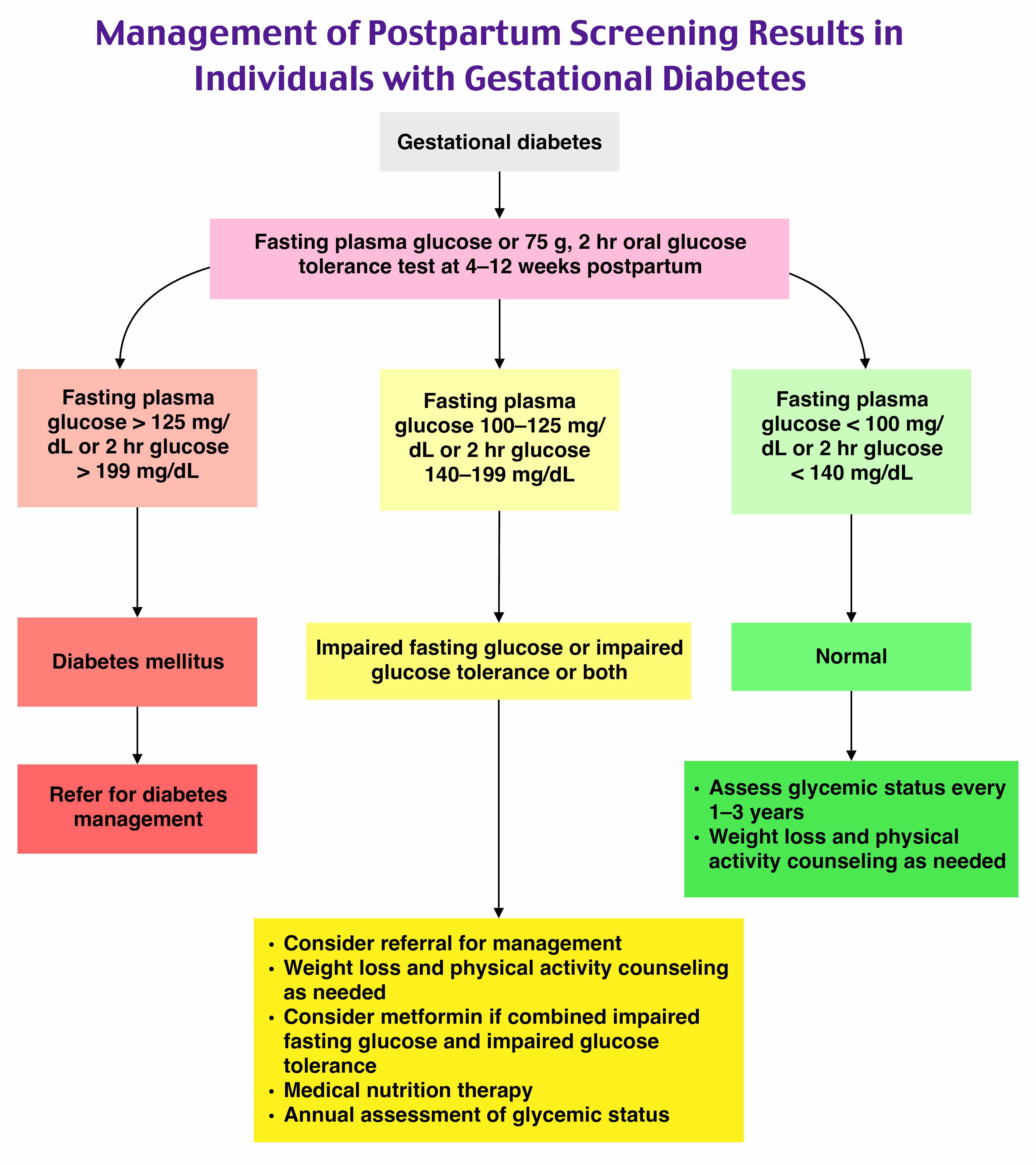 Gestational diabetes mellitus affects approximately 6-7% of pregnancies in the United States, with prevalence varying in proportion to the prevalence of type 2 diabetes in the population. Gestational diabetes mellitus is associated with an increased risk of preeclampsia, operative delivery, and fetal complications including macrosomia, shoulder dystocia with associated birth injury, hyperbilirubinemia, and neonatal hypoglycemia. Up to 70% of patients with gestational diabetes will develop type 2 diabetes later in life. A 2-hour glucose tolerance test is recommended in the postpartum period for all patients with gestational diabetes in order to identify those with diabetes mellitus or impaired glucose metabolism postpartum. This is typically performed between 4–12 weeks postpartum and consists of a fasting plasma glucose level and a 2-hour plasma glucose level following a 75 g oral glucose load. A fasting plasma glucose level < 100 mg/dL and a 2-hour plasma glucose level < 140 mg/dL is consistent with normal fasting glucose and normal glucose tolerance. Patients with a history of gestational diabetes and normal glucose tolerance and fasting glucose postpartum should receive nutrition and weight loss counseling as needed and should undergo assessment of their glycemic status every 1–3 years.